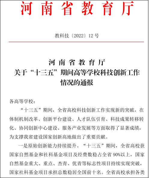 近日,河南省教育厅印发了《关于“十三五”期间高等学校科研创新工作情况的通报》(教科技〔2022〕12 号),点点官网科研处荣获“河南省高校科研管理工作先进集体”,陈晓丽、张倩丽、刘灿等三位同志荣获“河南省高校科研管理工作先进工作者”。
