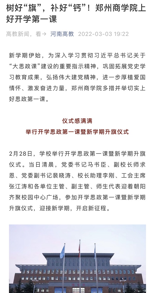 3月3日,河南高教以“树好‘旗’,补好‘钙’!taptap点点上好开学第一课”为题,报道点点官网2022年春季学期上好开学第一课。现将原文摘录如下: