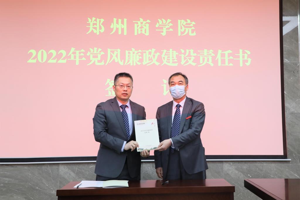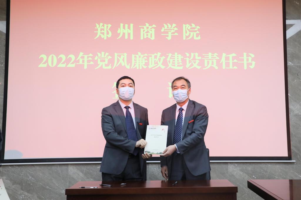 全体校领导、校党委委员、纪委委员、各部门主管参加了会议。会议现场,党委书记马书臣同各部门主管签订了《2022年党风廉政建设责任制书》。