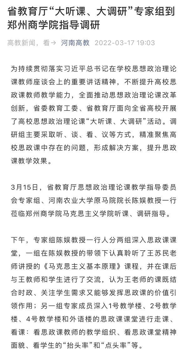 为持续贯彻落实习近平总书记在学校思想政治理论课教师座谈会上的重要讲话精神,不断提升高校思政课教师教学能力,全面推动思想政治理论课改革创新,中共河南省委教育工委、河南省教育厅面向全省高校开展了高校思想政治理论课“大听课、大调研”活动。调研组主要采取听、谈、看、议等方式,精准聚焦高校思政课中存在的问题,形成解决方案,提升思政课教学效果。
