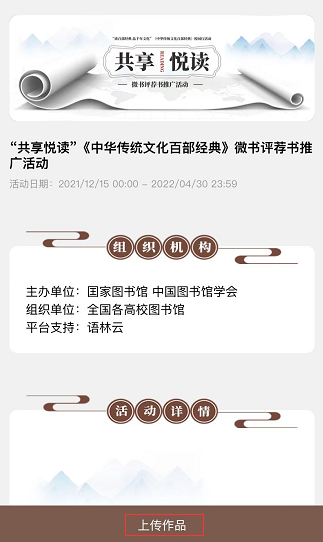 第二步:注册完成后,进入活动页面选择“共享悦读”微书评荐书推广活动,点击上传作品。