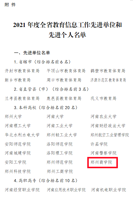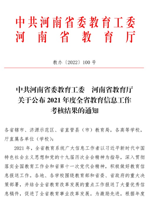 近日,省委教育工委、省教育厅发布了《关于公布2021年度全省教育信息工作考核结果的通知》(教办〔2022〕100号),点点官网荣获“2021年度河南省教育信息工作先进单位”,新闻中心张影、唐帅虎2位同仁被评为“全省教育信息工作先进个人”。