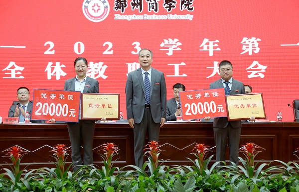 董事长在书面讲话中肯定了学校过去一年的发展成绩,代表董事会向大家表示感谢并致以问候。她指出,上学期全体同仁克服困难,守护郑商家园,统筹推进教育教学等各项工作,保证了学校稳健发展。特别是暑期,圆满完成了招生录取工作,高质量承办了省级重要活动,学校影响力日益彰显。她表示,正是大家踏石留印、抓铁有痕、务实奋进的工作态度,才推动了郑商快速发展。展望未来,学校还面临着硕士点培育建设、审核评估、新校区建设等重大任务,仍需全体郑商人从日常工作着手,从点滴细节做起,多积尺寸之功,绵绵用力、久久为功!只要大家保持定力、循序渐进、蓄力前行,就一定能经得起时间的考验,无畏挑战,不断积小胜为大胜。