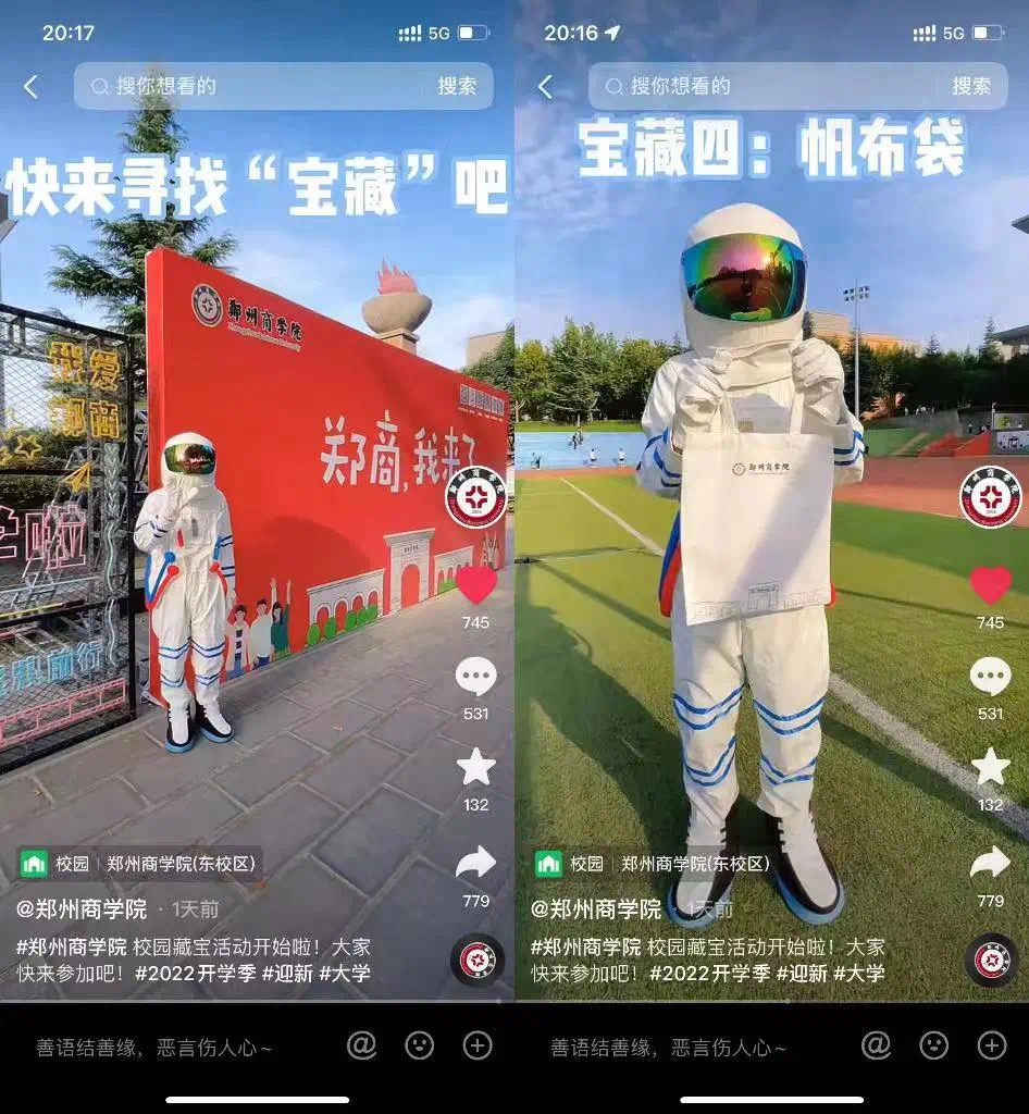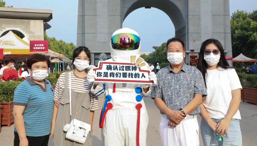 当然,学校还组织了活动,吸引新生互动——学长学姐们用歌声和舞姿为新生送上开学祝福,熟悉的“太空人”玩偶在校园内与新生热情舞动,传递郑商温度。