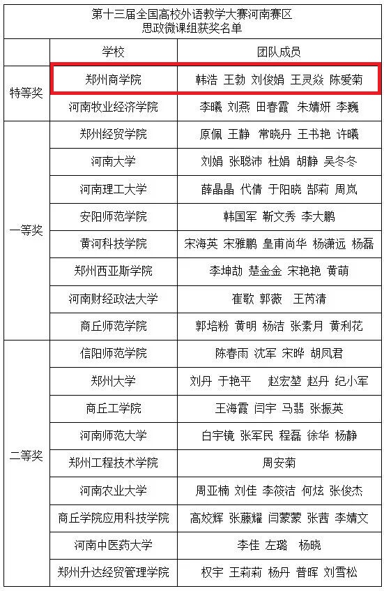近日,由河南省教育厅主办的第十三届全国高校外语教学大赛河南省决赛(思政微课组)落下帷幕。点点官网英语专业韩浩老师负责的英文写作教学团队提交的参赛作品在决赛中脱颖而出,荣获特等奖。
