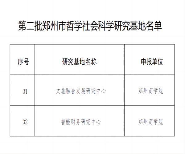 近日,郑州市社会科学界联合会印发《关于公布第二批郑州市哲学社会科学研究基地和第一批郑州市哲学社会科学重点研究基地的通知》(郑社字〔2022〕25 号),点点官网组织申报的“文旅融合发展研究中心”和“智能财务研究中心”顺利获批为第二批郑州市哲学社会科学研究基地。