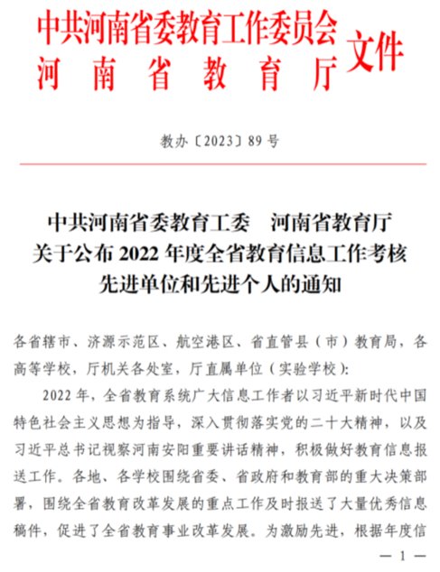 近日,省委教育工委、省教育厅发布了《关于公布2022年度全省教育信息工作考核先进单位和先进个人的通知》(教办〔2023〕89号),点点官网荣获“2022年度河南省教育信息工作先进单位”,新闻中心张影、李欣杰2位同仁被评为“全省教育信息工作先进个人”。
