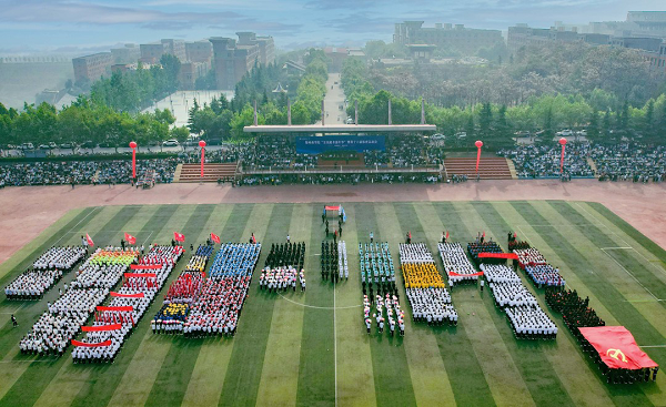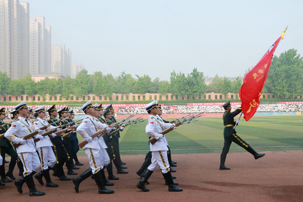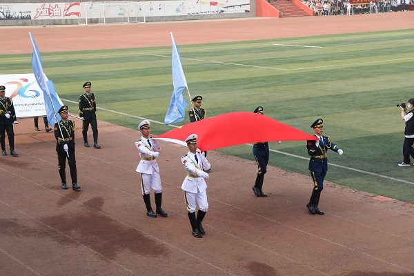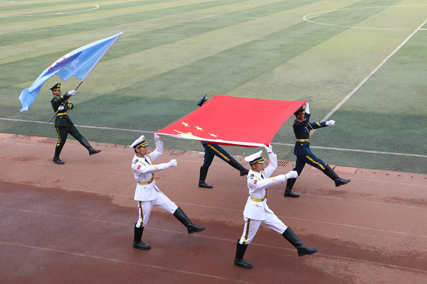 入场仪式中,国旗护卫队迈着铿锵有力的步伐,护卫着国旗、校旗、会徽庄严入场。