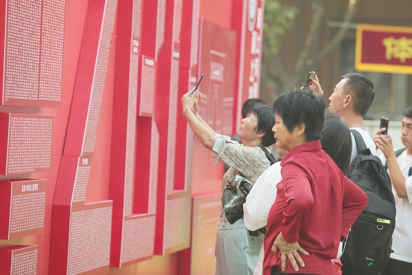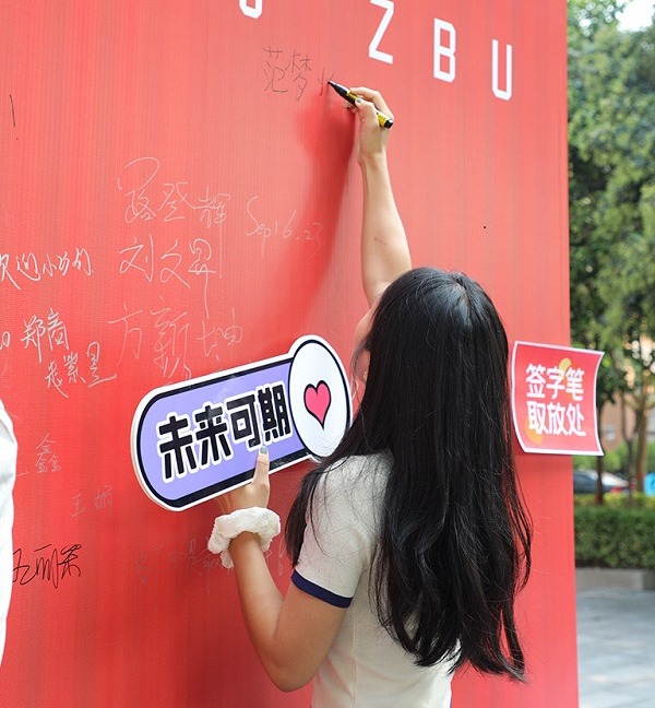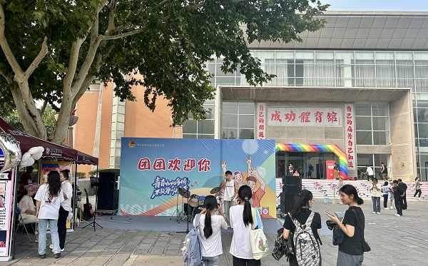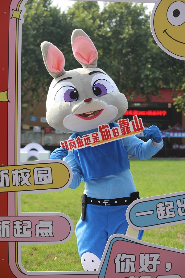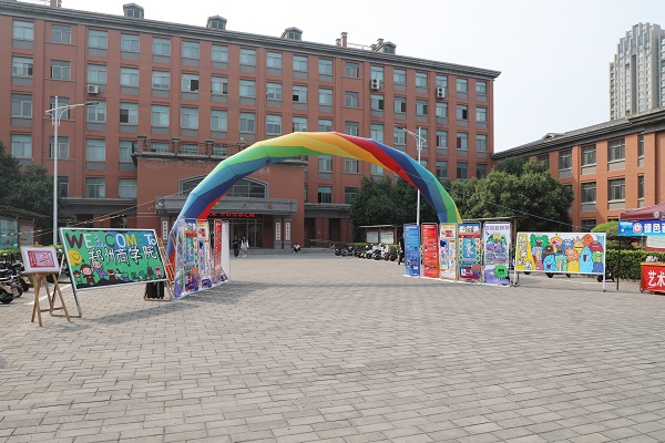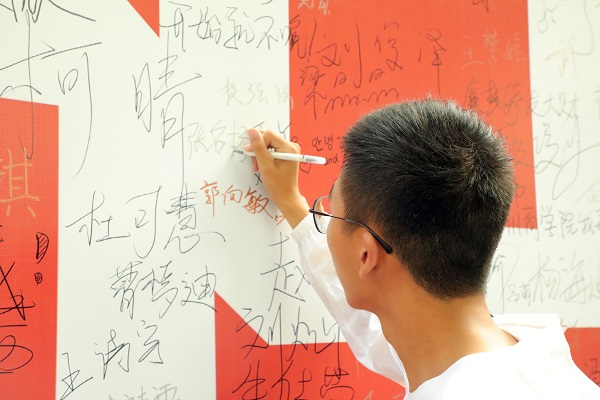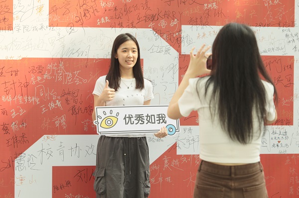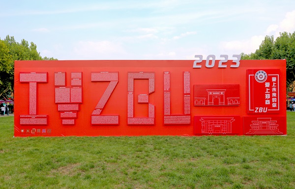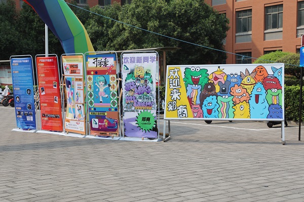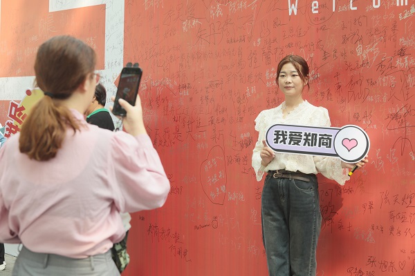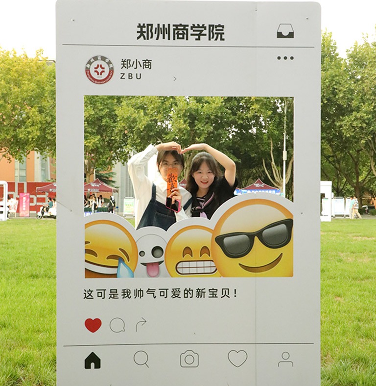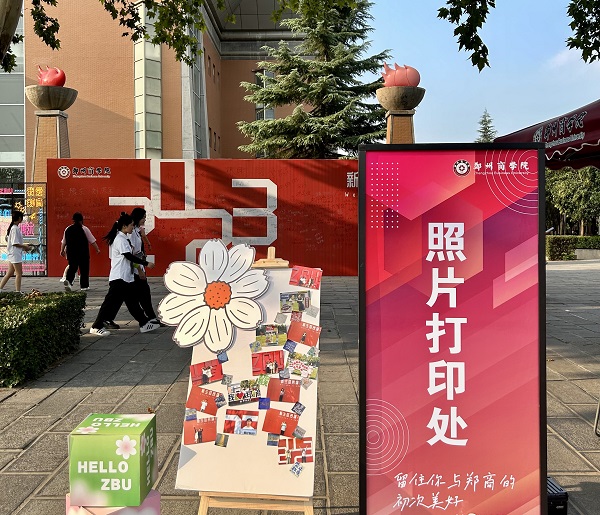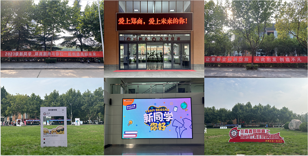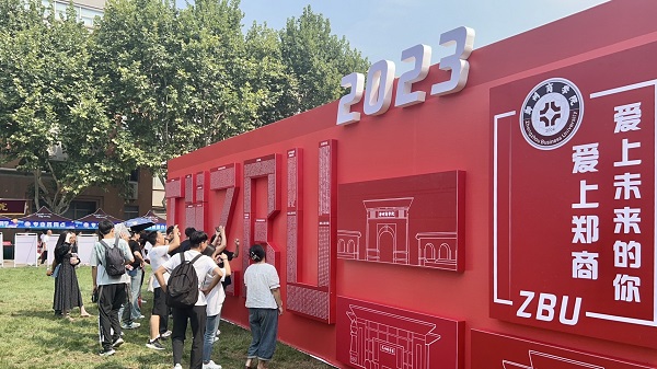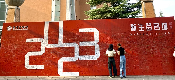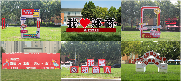 学校中心广场巨幅喷绘上的“I♥ZBU”是由所有2023级新生名字构成,因为你们,这份爱在九月洒满郑商校园;新生签名墙,合影打印,留住与郑商的初遇美好。