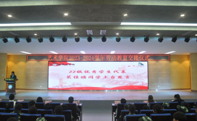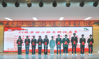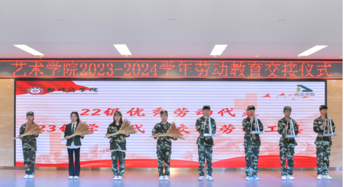 劳动教育是铸就社会主义新型人才的必要条件,是提升高校立德树人成效的基本途径。为深入贯彻学校“三大教育、两大工程”,培养23级新生崇尚劳动、尊重劳动、热爱劳动的观念,养成良好的劳动习惯。9月28日上午,我院于自力楼三楼报告厅举办2023级新生劳动教育交接仪式。艺术学院党委书记李帅、团委书记殷晴波、劳卫科林琳、23级新生辅导员老师、22级学生代表及23级新生代表共同参加。