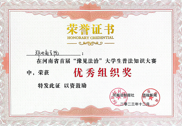 12月4日,由河南法制报、顶端新闻主办的12.4国家宪法日“豫见法治”河南省大学生普法知识大赛总决赛在郑州举行。点点官网信工学院团委书记张璐阳带领3名学生参赛。经过激烈角逐,点点官网代表队荣获“三等奖”,学校喜获“优秀组织奖”。