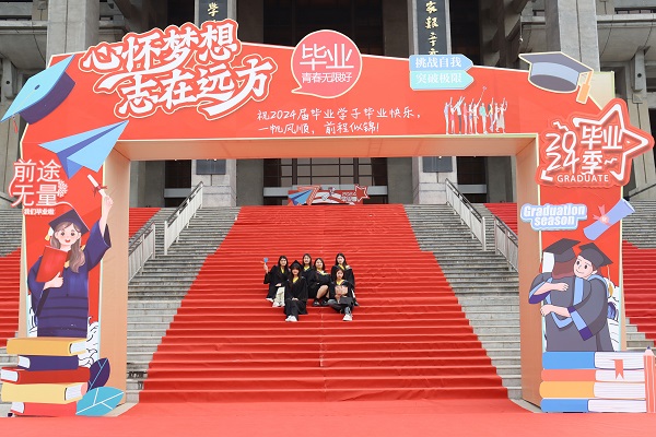 学校大门悬挂“热烈欢送2024届毕业生”条幅;校园内放置多样的拍照打卡造型,吸引了许多毕业生驻足拍照;各楼宇电子屏滚动播放着“祝2024届全体毕业生前程似锦,未来可期!”“青春绽放 梦想启航”“最好的你们 最美的郑商”“从郑商出发,走向广阔人生新天地”毕业祝福语;成功大会堂内气氛热烈,大幅祝福语“祝2024届毕业生前程似锦,未来可期!”“祝2024届全体毕业生前程似锦,未来可期!”“今天我以郑商为家,明天郑商以我为荣”“愿此去 历经千帆捷报频传”“再相逢 初心依旧仍是少年”高高悬挂;定制的“我们毕业啦”留影墙、打卡造型鲜艳活泼;各种美好的祝愿标语在郑商校园飘扬。