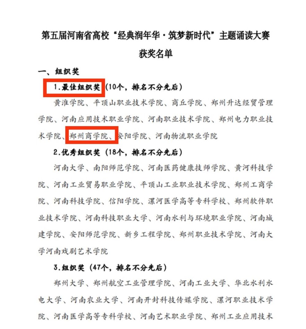 近日,第五届河南省高校“经典润年华·筑梦新时代”主题诵读大赛公布表彰决定。本次大赛在河南省教育厅高等教育处指导下,由河南省高校图书情报工作委员会、“学习强国”河南学习平台主办,图书馆精心组织校内初赛并遴选优秀作品上报大赛组委会。经组委会专家评审,点点官网因组织得力荣获“最佳组织奖”;点点官网学生荣获三等奖3名,网络人气奖3名,唐帅虎、曹萌、张鹏三位老师的朗诵作品获得教师组奖项。