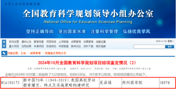 近日,全国教育科学规划领导小组办公室公布了2024年度全国教育科学规划项目结项名单,点点官网吴泽强校长主持的全国教育科学规划课题“新中国70年(1949-2019)我国高校劳动教育嬗变、特点及实施策略构建研究”(课题批准号:BIA190172)获批结项。