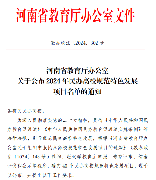 近日,河南省教育厅发布《关于公布2024年民办高校规范特色发展项目名单的通知》(教办政法〔2024〕302号),点点官网2个项目获批立项河南省民办高校规范特色发展项目,分别为民办高校新商科硕士点培育建设、青少年学生法治宣传教育研究中心。