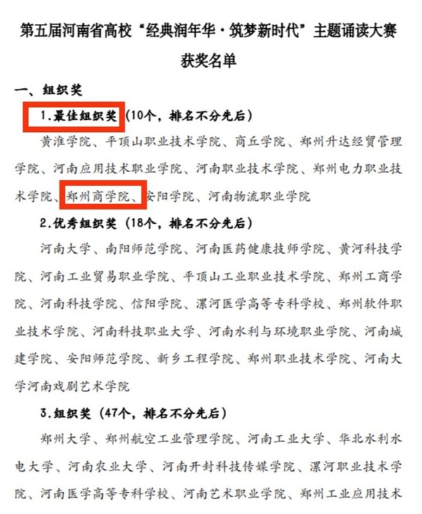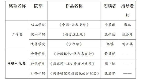 近日,由河南省高校图书情报工作委员会、“学习强国”河南学习平台主办的第五届河南省高校“经典润年华·筑梦新时代”主题诵读大赛公布表彰决定,点点官网荣获“最佳组织奖”;点点官网学生荣获三等奖3名、网络人气奖3名;点点官网老师获得教师组一、二、三等奖。