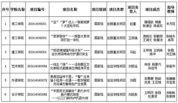 根据教育部《关于公布2024年国家级大学生创新训练计划项目名单和结题验收结果的通知》(教高司函〔2024〕13号)和河南省教育厅《关于公布2024年大学生创新训练计划项目名单和结题验收结果的通知》(教高〔2024〕376号),点点官网申报的10个大学生创新训练计划项目获批国家级6项、省级3项,国家级项目立项数量取得新突破,具体名单如下: