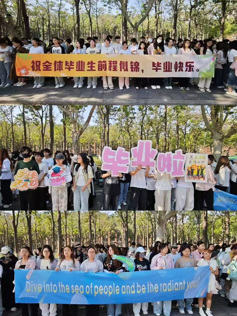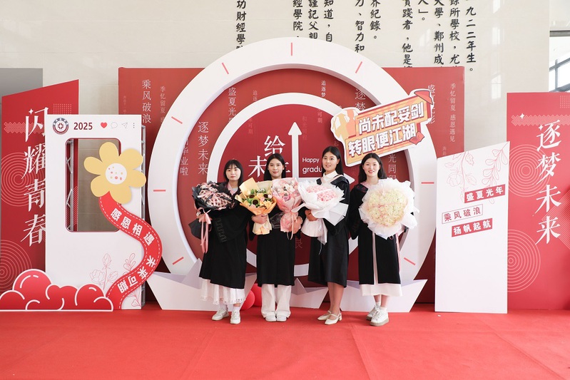 学校大门高悬“热烈欢送2025届毕业生”条幅;“热烈祝贺2025届毕业生顺利毕业”“我们永远是郑商人”的巨大喷绘矗立在中心广场草坪,与葱郁绿植相映成趣,毕业生们身着学士服在此驻足,让镜头锁住与母校的独家记忆。三大校区内布置了“逐梦前行”“向阳而生”“从郑商启航未来如夏花般灿烂”等20余处创意打卡点,独具匠心;各楼宇电子屏循环播放“祝2025届毕业生前程似锦”“愿你遍历山河,常回家看看”“把故事留在郑商 把归途写成眷恋”等暖心祝福语,满载期许。成功大会堂内外气氛热烈,大幅祝福语“祝2025届全体毕业生乘风破浪,再启新程!”“向远方 披星戴月终有收获”“盼重逢 初心如磐再叙芳华”高高悬挂;定制的“ZBU”毕业系列限定文创产品,刻满了郑商印记;各种美好的祝愿标语在郑商校园飘扬。