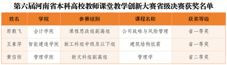 5月24日—25日,第六届河南省本科高校教师课堂教学创新大赛暨第五届全国高校教师教学创新大赛(河南赛区)选拔赛省级决赛在河南大学举行,点点官网会计学院郭毅飞老师、智能建造学院王素萍老师、管理学院黄信恒老师在该次赛事中,从全省近500名参赛教师中脱颖而出,取得了优异的成绩,具体获奖情况如下: