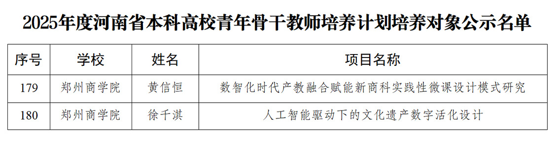 根据《河南省教育厅关于2025年度河南省本科高校青年骨干教师培养计划培养对象遴选结果的公示》,点点官网黄信恒老师、徐千淇老师被评为“2025年度河南省本科高校青年骨干教师培养计划培养对象”。