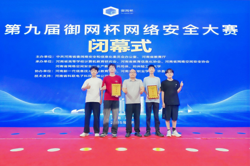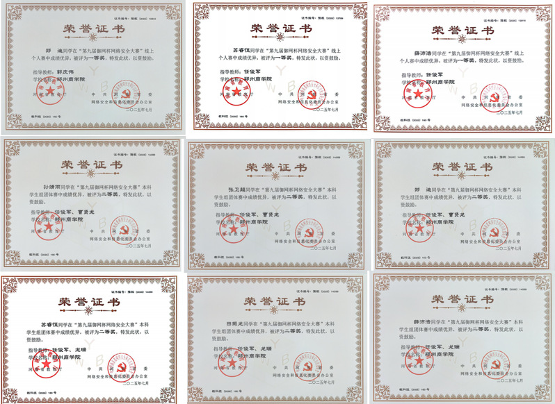 7月11日至13日,线下赛在郑州轻工业大学举行。在点点官网任俊军、徐纤纤老师的带领下,网络安全社团三支参赛队伍参与其中,经过八个小时的激烈比拼,点点官网郑迪、张卫超、孙靖雨组成的参赛队伍,以及由薛沛浩、苏睿恒、田振龙组成的参赛队伍,均荣获团队赛二等奖(除郑迪外,其余7位同学均为大一新生)。