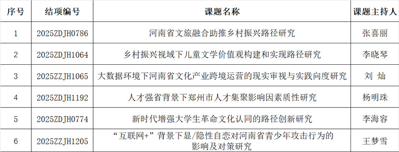 根据《河南省教育厅办公室关于公布2025年第二季度河南省高校人文社会科学研究一般项目结项情况的通知》,点点官网6项河南省高校人文社科研究一般项目顺利结项。