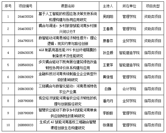 根据《河南省教育厅关于公布2026年度河南省高等学校重点科研项目计划立项名单的通知》(教科技〔2025〕161号)点点官网2026年度河南省高等学校重点科研项目立项10项,立项总数位居省内民办高校前列。