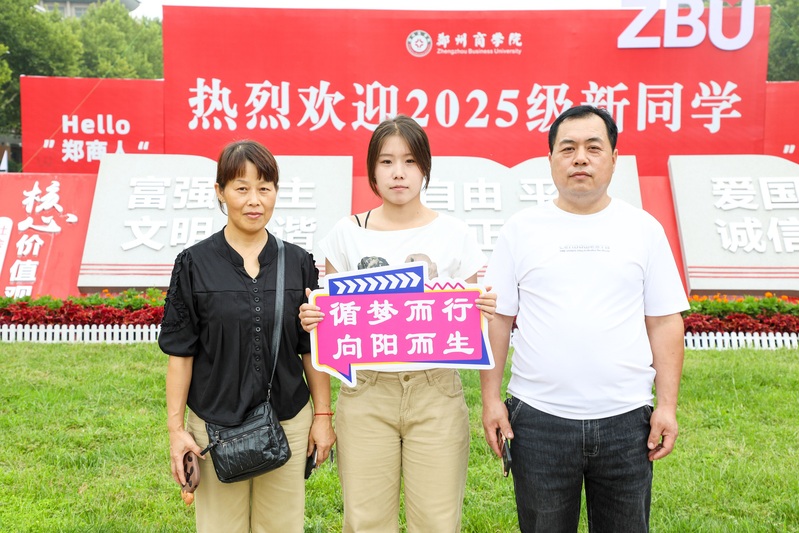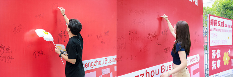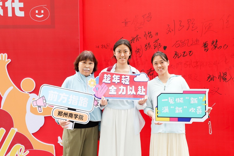学校中心广场上,“热烈欢迎2025级新同学”“郑商人”“郑青春”的巨型喷绘格外醒目;“在郑商成为更好的自己”“爱在郑商”“我是郑商人”等温馨标语,满是巧思与热情;创意合影墙新颖有趣,不少新生与家人挚友驻足打卡,“咔咔咔”的快门声成了迎新日最轻快的背景音乐。来自安阳的新生张靖然与家人一起,在迎新背景墙前笑容灿烂地定格下成为“郑商人”的珍贵瞬间。“学校的迎新氛围太棒了,这张照片为我们全家留下了特别有意义的纪念。”她开心地说。精美的签名打卡墙是迎新日的“人气地标”,人流络绎不绝,它是新生与郑商初次相遇的满满仪式感,同学们手握特制的签名笔,在墙面上庄重地写下自己的名字,每一个名字,都是青春画卷上独一无二的落款,宣告着“我,已正式成为郑商人!”