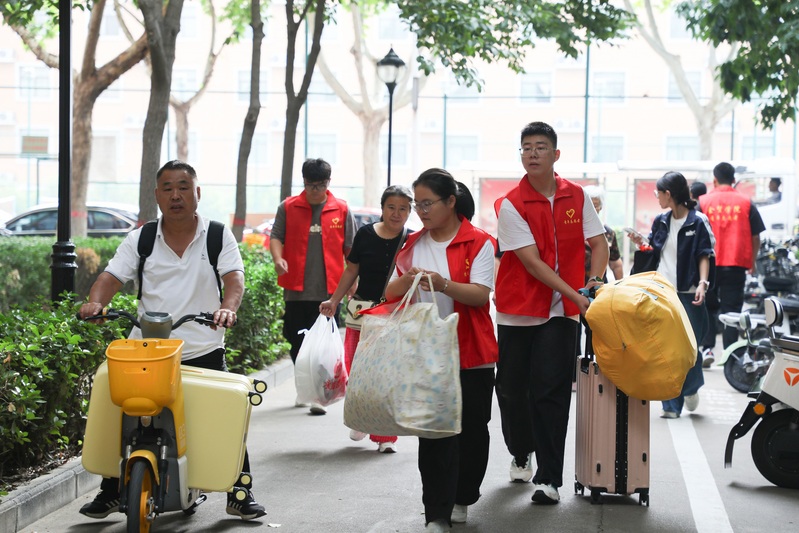 迎新期间,学校在火车站、高铁站设立接待点,确保每一位晚点抵达的新生都能感受到“家”的温暖。同时,优化了入校交通路线,新增多个路牌导航,校内安保人员和志愿者在校内交通要道定点指挥、维护秩序,有效分散人流。安保人员孟晓波说:“我们的职责就是守护校园秩序,今年提前进行了安排部署,整个流程会比去年更有序、更高效。”“9号楼,前面路口右转,直行两百米就能到!”志愿者万琰正在校园主干道上忙碌着,作为维护“交通枢纽”的一员,他的任务就是精准、快速地解答问询、引导车辆,确保校园交通顺畅、减少拥堵。