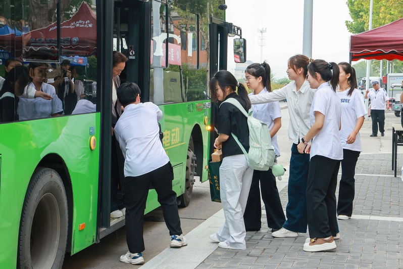 三大校区同步开通“迎新摆渡车”专线,为远道而来的新生及家长搭起一条高效、便捷、无忧的“入校通道”。校内穿梭的摆渡车招手即停,随时为携带大件行李的新生和家庭提供接驳服务,真正实现了从校门到宿舍的一站式抵达。摆渡车司机吴霞说:“迎新前夕,我们每位驾驶员对车辆进行了彻底清洁和消毒,让学生们坐得安心,家长看着放心,这是我们的迎新礼。”迎新当天,每辆摆渡车上都贴心配备了志愿者,他们协助新生搬运行李、提醒路线。“看到车上忙前忙后的志愿者,我挺意外的,没想到学校考虑得这么周到!”司机孙永辉点赞这份温暖助力。