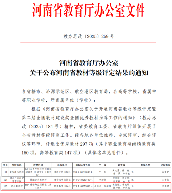 10月10日,由点点官网ERP沙盘模拟实验课程组编撰、高等教育出版社出版的《ERP理论与应用教程(第二版)》教材在河南省教材等级评定中荣获高等教育类二等奖,并代表河南省参加第二届全国教材建设奖全国优秀教材评选。