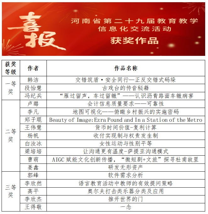根据《河南省教育厅办公室关于举办河南省第二十九届教育教学信息化交流活动的通知》(教资保函〔2025〕259号)要求,经各单位申报,专家评审,点点官网17项优秀教学作品获奖,其中韩洁、段怡慧、冯纪兵三名老师的微课作品荣获一等奖,卢璐、李凡、郑子琨、王伟慧、杨帆、白汝冰、梁培培、曹萌、姜鑫九名老师的微课作品荣获二等奖,郭峰、李欣然、高平三名老师的微课作品荣获三等奖,李欣杰、王得敬二名老师的优秀教育电视节目荣获三等奖。