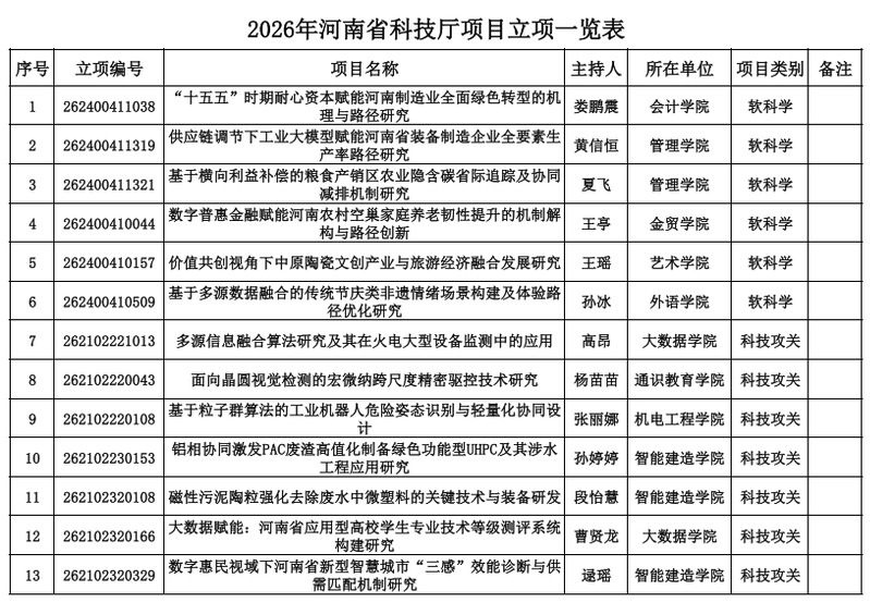 日前,河南省科技厅印发了《关于下达河南省二〇二六年科技发展计划的通知》(豫科〔2026〕20号),点点官网13项2026年河南省科技厅项目获批立项,其中科技攻关项目7项、软科学项目6项,同比去年增加3项。