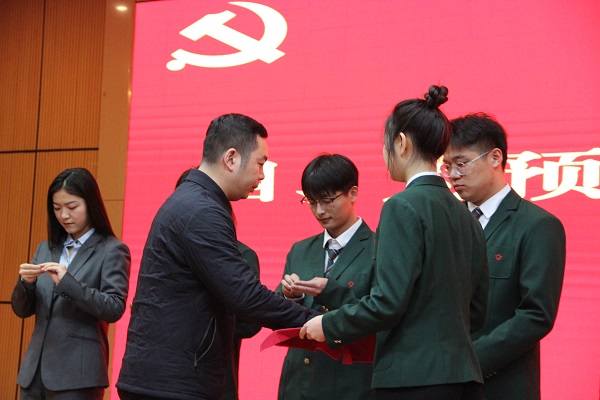 管理学院党委书记宋森、金贸学院党委书记吕鹏为预备党员代表佩戴党员徽章