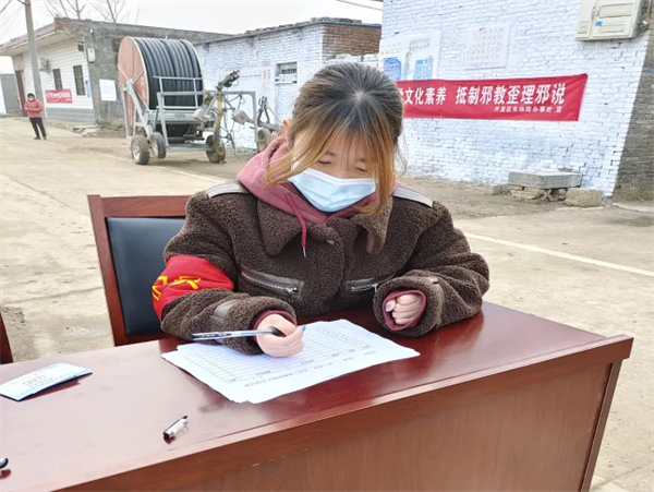 在寒假期间,她秉着积极响应党员干部的思想,主动报名参加村里的志愿者。对每家每户进行调查,将信息录入系统,做到不落下一门一户,在调查的时候遇到村民不理解的情况,她主动地给村民讲解清楚。她说:“我相信,经过我们的努力,我们会把工作完成的很好。这次志愿工作更进一步的体验到一线工作人员的责任巨大,我的学习和幸福生活都在这条巨龙的保护下才得到保障,更深刻的体验到了我国的担当与使命!