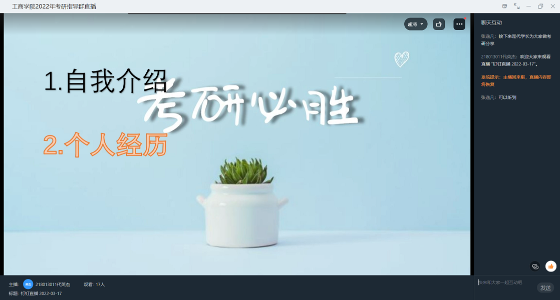 为持续推进我院2022届毕业生考研复试工作,更好地落实 “稳就业、保就业”的全面部署,全力促进毕业生更加充分更高质量就业,3月17日晚,我院组织开展线上考研指导主题报告会——学长学姐说考研。我院2022届毕业生及优秀考研校友陈秋格、代英杰、梁亚停参加会议。