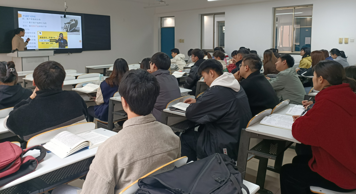 三位老师教学准备充分,教学重难点突出,在课堂教学中充分尊重学生学习主体地位,循循善诱,引导学生自主探究、相互协作,课堂授课形式灵活、教学效果较好。李欢欢老师老师以樊登读书、学生日常购物偏好为例逻辑清晰地讲授基于客户选择行为的客户价值的分类这一重要知识点,课堂互动频繁,学生学习积极性高。