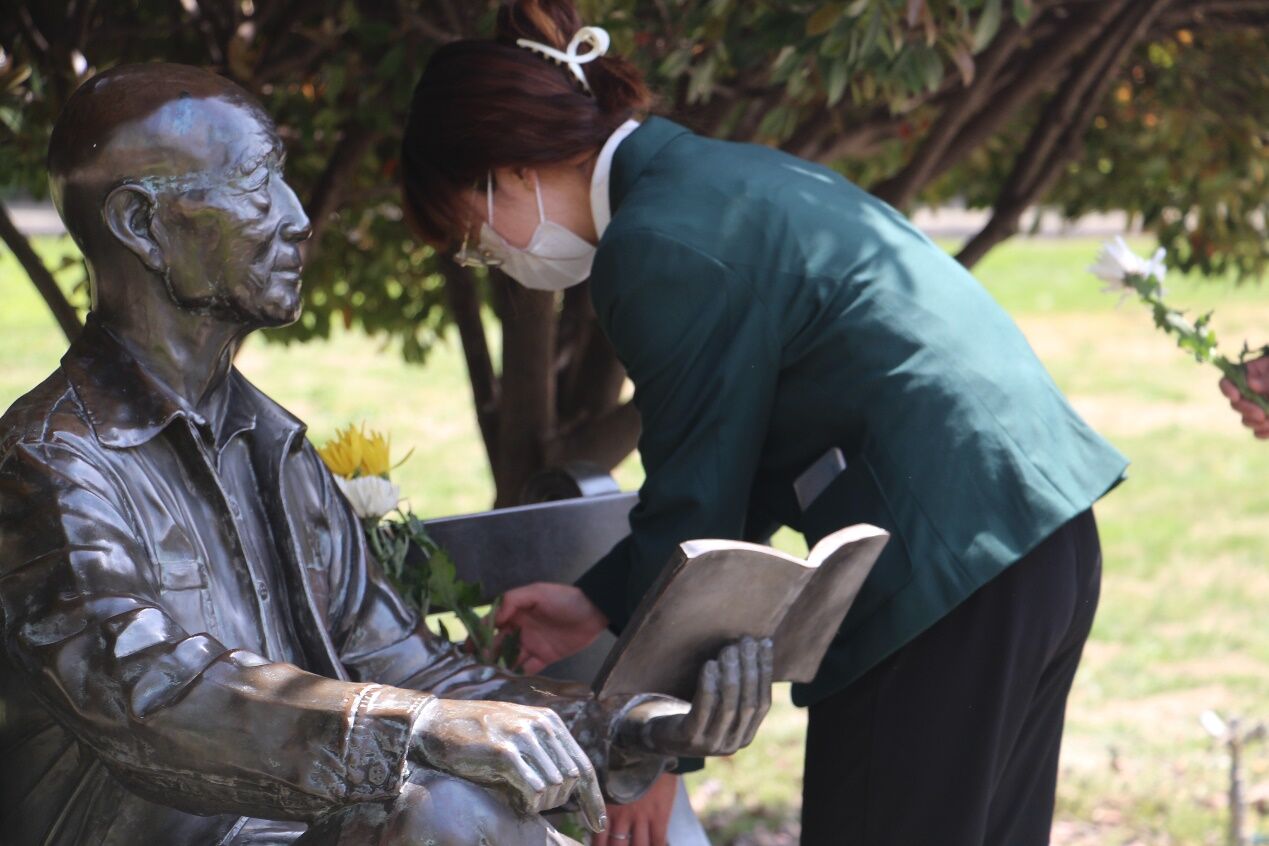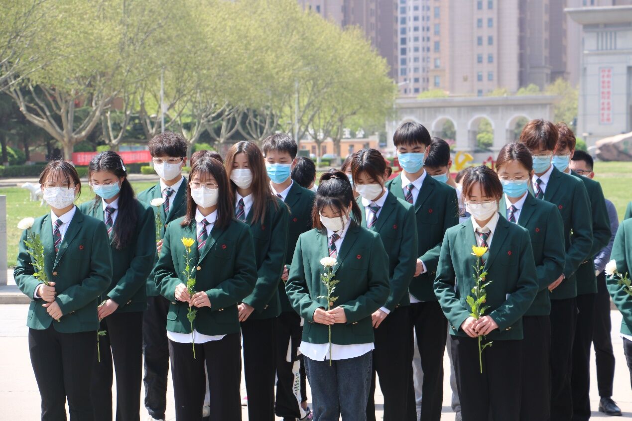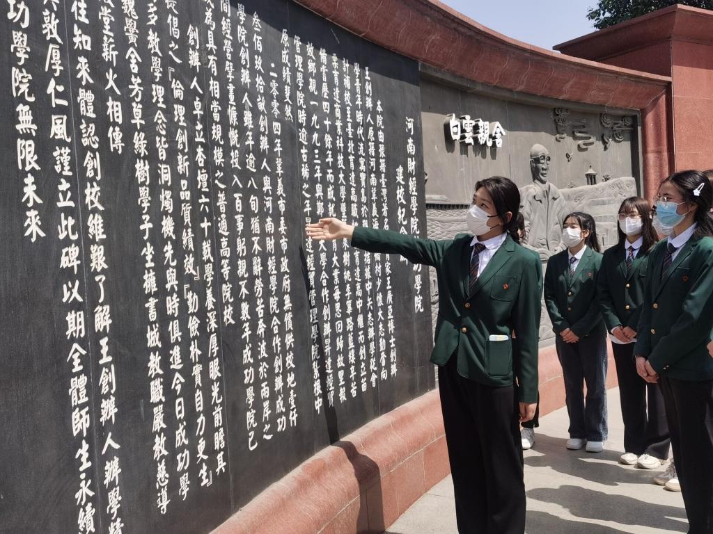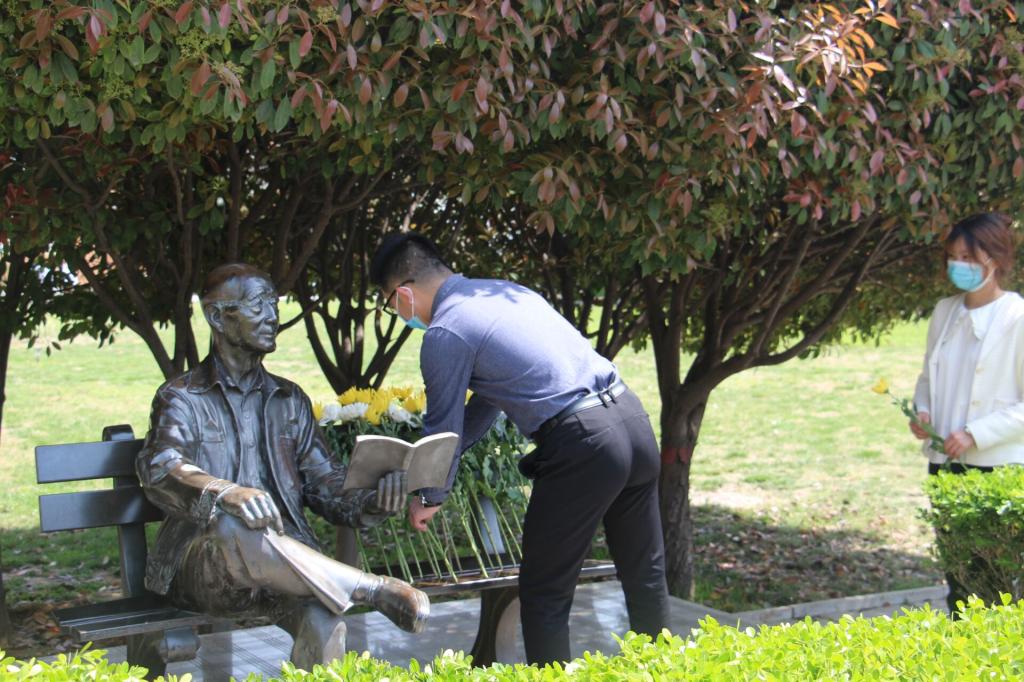 孟瑶带领大家回顾了创办人的一生,大家为先生倾尽毕生心血投身教育事业的精神而深深感动。接着,全体人员手捧花束,心中怀着对创办人的无限思念和感恩,肃穆默哀,并鞠躬致礼并献上花束,以此表达对先生的感恩与追思。最后,大家到建校纪念碑前,再次深入学习了解建校历史,重温了创办人的办学理念。