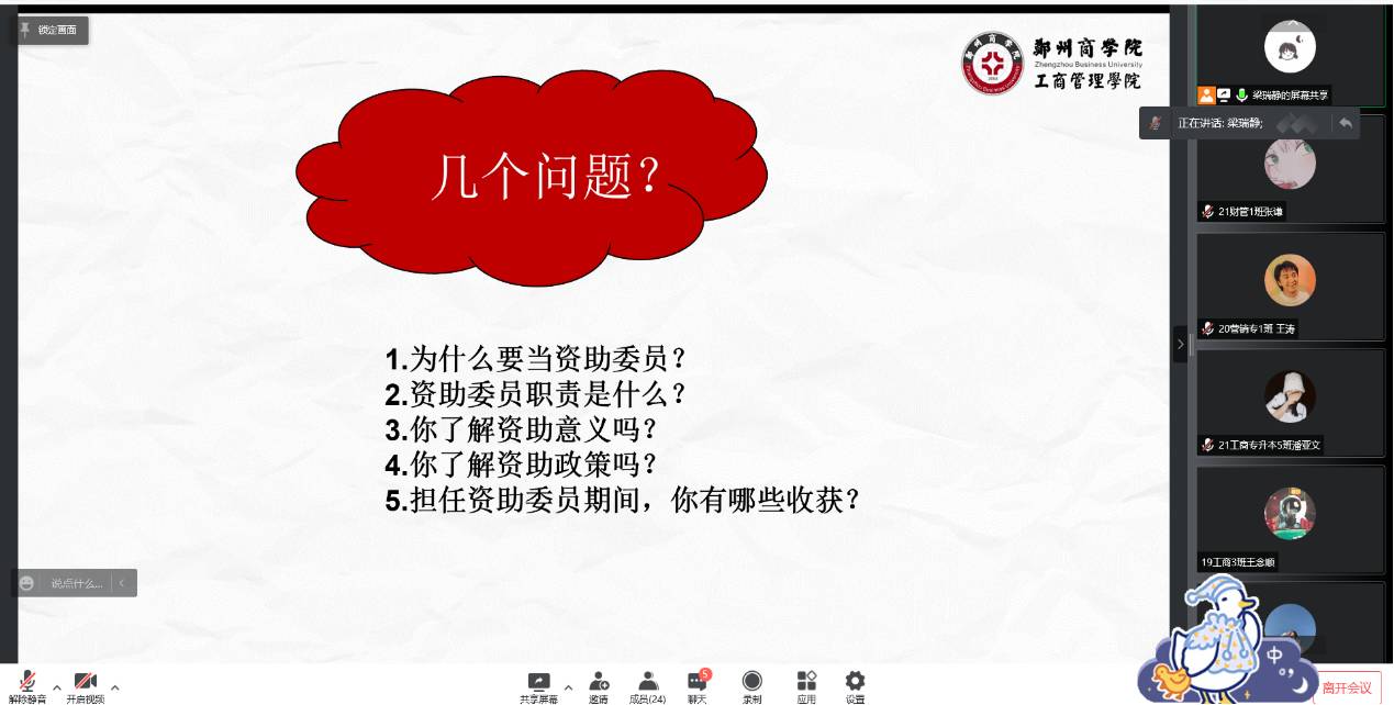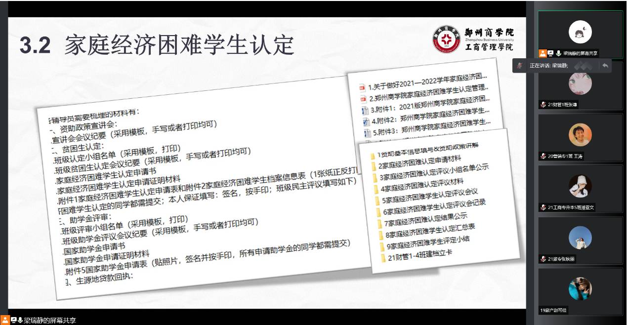 为进一步提升资助委员的职位理解、扩展其资助知识,更好的为同学提高专业服务,4月6日,我院资助领导小组对全院资助委员开展的资助知识培训。因疫情原因,此次培训通过腾讯会议进行。