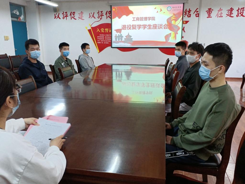 为进一步贯彻落实党的十九大关于“维护军人军属合法权益,让军人成为全社会尊崇的职业”的精神,积极落实退役军人相关优待政策,建立健全退役复学学生帮扶机制,我院于4月16日晚在2号教学楼2206会议室召开工商学院2022年退役复学学生座谈会,我院征兵工作负责人张金凤老师和退役复学学生代表参加了此次座谈会。