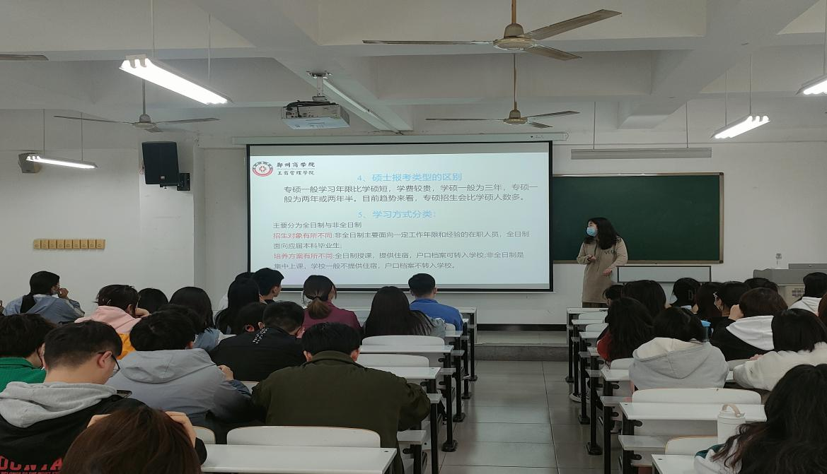 4月15日上午第四节在2号楼301教室针对2019级工商专业学生召开考研指导交流会。此次考研指导会从学生选择报考学校、考研专业和考研地区等方面指导学生在考验过程中如何进行规划,从而更好地计划考研进程,提升工商管理考研升学率。
