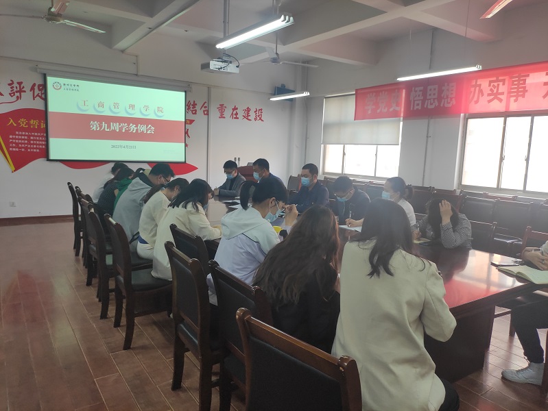 为进一步贯彻落实学校疫情防控和校园安全稳定各项工作安排,稳步推进学生管理工作,确保学生在校期间的安全,4月21日下午,工商学院组织在2号楼二楼会议室组织开展2021-2022学年第二学期第九周学务例会。我院党委书记宋森、团委书记董文浩及全体辅导员参加会议。