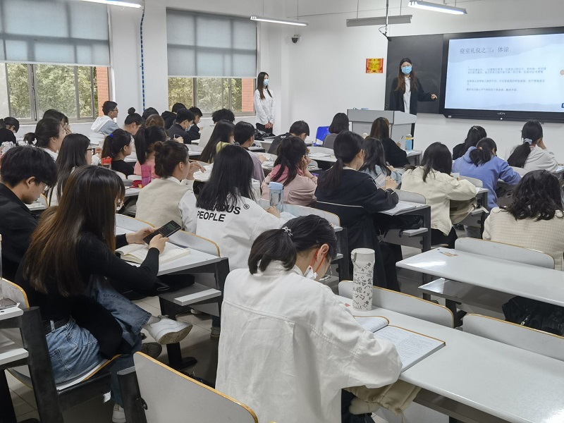 工商管理学院组织礼仪宣讲团进入各班级进行文明礼仪宣讲。礼仪是校园文化的重要表现形式,“一言一行见修养,一颦一笑见气质”,工商管理学院文明礼仪宣讲团旨在丰富大学生的礼仪知识,传播文明礼仪之风。从夏季文明着装礼仪、男女文明交往礼仪、宿舍文明礼仪、疫情防控文明礼仪等多个层面出发,倡导同学们践行文明礼仪规范,明白文明礼仪的重要性,争做具有高素质、高修养的大学生。在神态、肢体、语言、着装等方面指导并规范同学们的文明礼仪行为 。进一步加强同学们的文明行为,增强同学们的文明意识,提高文明素养,培养自己成为讲文明懂礼仪的大学生。