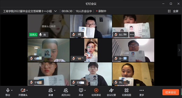 线上答辩使用平台为钉钉,各答辩组提前安排,并组织模拟演练,主动联系并帮助学生克服设备不足等困难。答辩时由答辩秘书发起会议,答辩老师和学生加入会议。学生通过钉钉会议,辅助以PPT的形式进行论文自我陈述,并严格按照论文答辩程序回答答辩组提出的问题,各答辩评委老师提出论文修改建议。