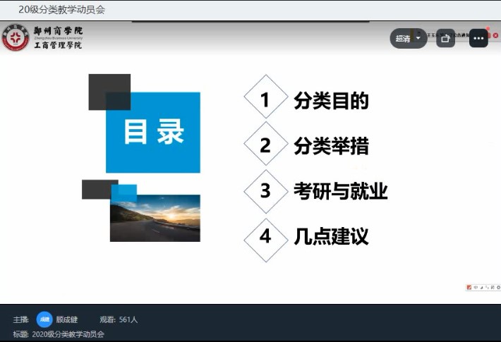 接着张卫丽副院长汇报了学院2020级分类教学的总体方案,从目的、举措、考研与就业和建议四个层面展开,措施方面从分类教学类型、分班流程、实施路径、管理机制等加以实施。重点讲解了专业人才培养方案,希望大家认真思考,帮助同学们分析就业和考研的基本形式,鼓励大家坚定信念,强调任何选择都需要努力奋斗,希望同学们能够结合自己实际情况进行分类方向的选择,指导同学们提前做好职业选择规划和继续求学的计划。