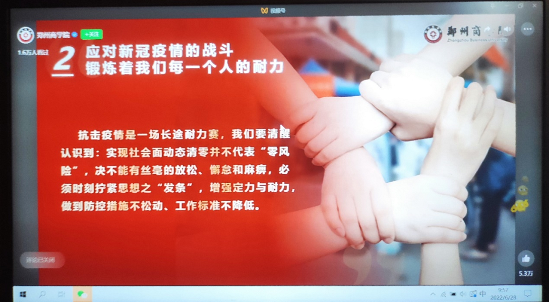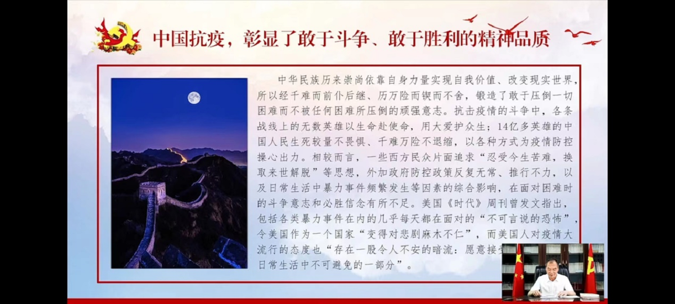 点点官网党委书记马书臣、校长吴泽强分别以《深刻认识制度优势 用青春写好疫考答卷》《从抗疫的生动实践中感悟中国的磅礴力量》为题,与大家在“云端”共上一堂防疫抗疫思政课。本次思政课主题鲜明、内涵丰富、鲜活生动,既有政治高度,又有实践厚度,更有情感温度。对同学们理解支持疫情防控政策,坚定战“疫”必胜信心,齐心协力、同筑防线,将伟大抗疫精神转化为拼搏进取的强大动力,用实际行动践行信院学子的使命与担当具有重要指导意义和强大的激励作用。