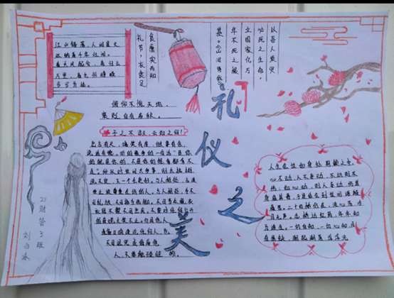 第三部分:礼仪之花。通过手绘礼仪作品,不仅培养了同学们的动手创造美以及感知艺术的能力,而且使同学们真切感受到礼仪教育的独特魅力,使其更加深刻的明白礼仪在生命中的至关重要的作用。作为新时代的青年,不论是在大家还是小家都不能忘记中华传统的礼仪,应把文明之种撒在大地,让文明之花开在心中!