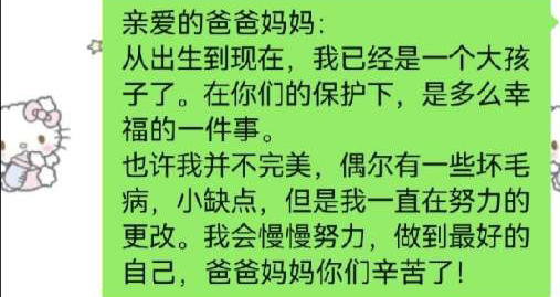 第二部分:礼仪行动。参与活动的学生借此机会通过文字向父母表达爱与感谢,增进父母与子女之间的感情,使亲情升温,信息发送成功后截图,最终将截图发送给宣传委员,宣传委员以此截图进行短视频制作,最终上传至短视频平台,让世界看见爱。中国自古以来就是礼仪之邦,古代圣贤无处不在践行着文明与礼仪。随和社会的发展,文明礼仪在我们的生活中愈发显得举足轻重,运用礼仪规范必须要行动起来,让礼仪走进家中。