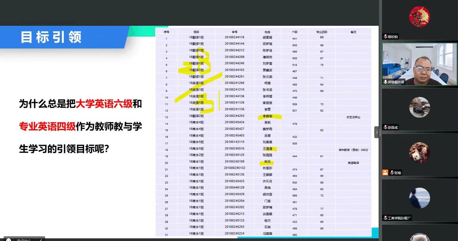 会议伊始,杨院长对外语学院邱院长一行百忙之中线上指导表示欢迎和感谢。随后,外语学院邱院长从问题导向、目标引领、持续提升三个方面传授做法,分析了当前学生的报考院校及英语成绩,针对问题制定措施进而改变;赵院长通过介绍家教式方法全面做好考研学生的管理服务工作。