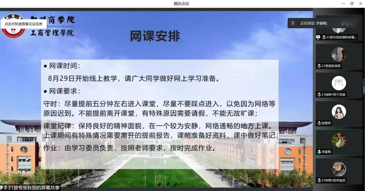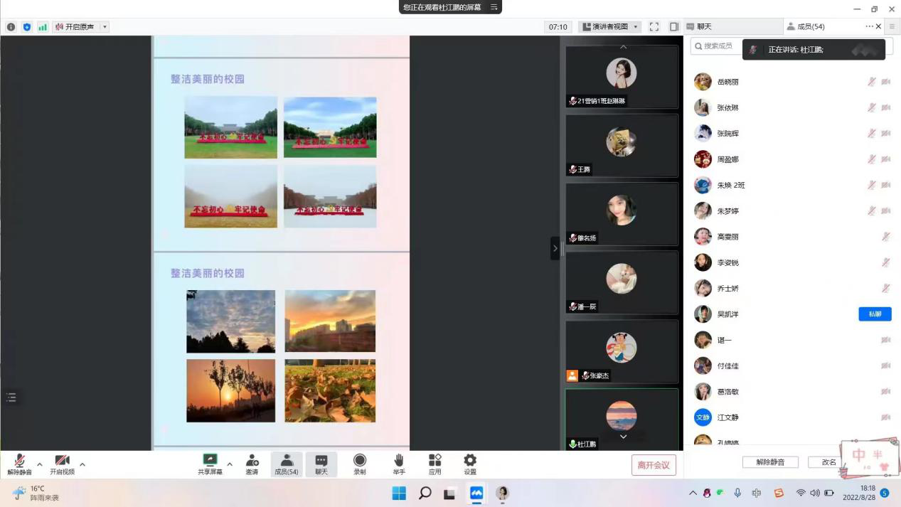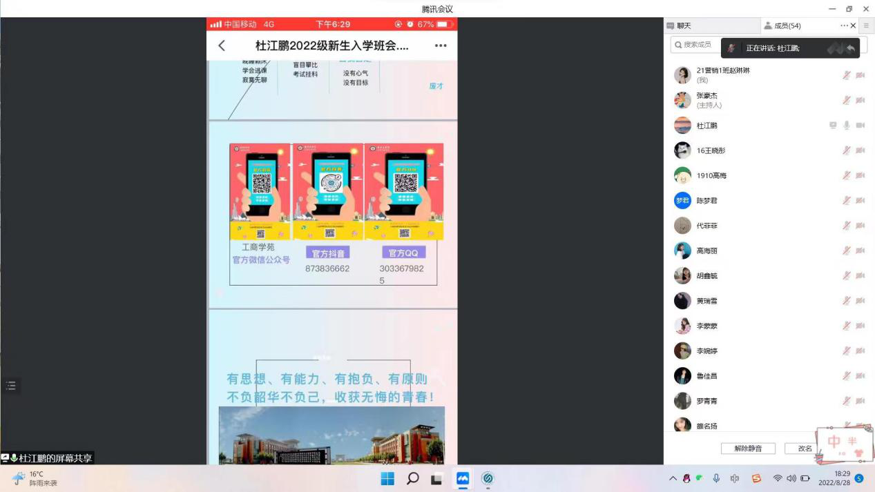 新学期预示着新的开始、新的征程、新的希望。为了让同学们尽快进行自我调整,明确新学期奋斗目标,营造良好学习氛围,以饱满的精神迎接新学期,8月28日晚,我院以班级为单位开展线上“2022年秋季学期收心主题班会”。